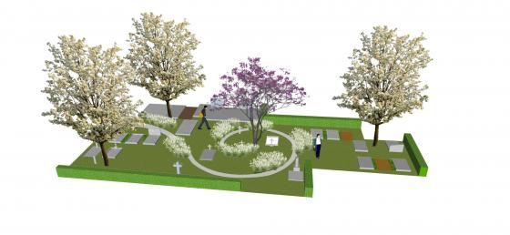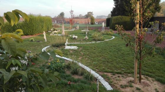 L’espace existant a été clairement délimité par une haie de chèvrefeuille arbustif afin de séparer visualiser l’espace réservé aux enfants des zones de circulation. Quatre entrées ont été conservées afin de permettre l’accessibilité interne aux tombes des enfants. Afin d’apporter une unité dans l’espace, Ecowal a suggéré l’implantation d’une spirale en gravier blanc, symbole de la pérennité de l’être vivant et du renouveau. Au centre de celle-ci, un arbre en cépée se dresse. Celui-ci offrira un feuillage orangé en automne et une floraison rosée au printemps. Des plantations de vivaces et de graminées ont été réalisées le long de cette spirale. Les trois Pyrus callaryana‘Chanticleer’ permettent d’apporter de l’intimité au site et de le rentre visible depuis l’entrée du cimetière. L ‘entièreté de la surface a été enherbée pour plus de facilité vec un mélange composé de graminées à croissance lente. Les espaces entre-tombes inférieur à 50cm ont été recouvert de vivaces couvre-sol.