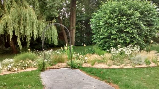 Afin s'assurer une croissance vigoureuse du noisetier situé au centre de la pelouse, un éclaircissage a été effectué en automne. Devant celui-ci, un parterre en forme de ''haricot'' à été dessiné au sol. Ce parterre sera ainsi visible depuis les deux entrées du jardin communal. Le parterre est délimité via des bordures en acier corten. A l'intérieur, des vivaces à floraison blanche ont été plantées au printemps. Ce parterre comprend un des plantes indigènes et horticoles mellifères aux inflorescences variées. Ecowal a veillé à une succesion de floraison tout au long de l'année. Ainsi, en hiver, alors que les graminées apporteront une structure verticale, un ensemble de bulbes à floraison blanches viendra égayer le tout. Pour appporter du contraste et dynamiser le parterre, Ecowal a opté pour l'implantation de quelques plantes au feuillage grisâtre et panaché blanc . Afin de limiter la croissance des adventices, une bonne densité lors de plantation a été assurée. Un paillage de miscanthus permet de limiter l'arrosage et l'entretien. Une arcade en fer forgé a été installée dans l'axe de l'entrée, devant le parterre. Deux rosiers grimpants blancs viendront s'y fixer.Un chemin en pavé a été réalisé pour y accéder.