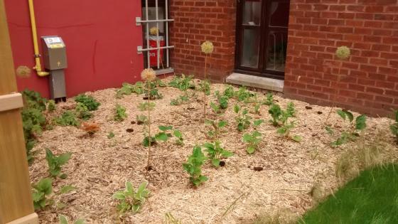 En rencontrant le responsable des travaux et l'éco-conseillère, Ecowal a pris connaissance du projet initial de la commune: créer un jardin des mariés à proximité de la salle des mariages Cete espace devrait également servir comme lieu de convivialité pour le personnel administratif, mais également constituer un lieu de passage. La commune souhaitait que le projet se fasse après les travaux de rénovation du chemin en pavés existant. Ecowal a suggéré en premier de repenser le tracé existant de ce chemin, dont le tracé était peu adapté à la circulation quotidienne. Le tracé depuis l'entrée du jardin a tenu compte du tracé spontané des passants. La table pique-nique existante a été conservée mais disposée de l'autre côté du sentier afin d'offrir un zone ombragée lors du temps de midi. Cette table de pique-nique n'encombrera ainsi pas l'espace réservé au jardin des mariés. Autour de cette aire de pique-nique, des plantations vivaces mi-ombre ont été réalisées le long du bâtiment. Un aménagement a été également préconisé pour atténuer la rampe métallique, visible de depuis l'entrée du jardin. Une structure en bois a été fixée sur la rampe, servant de soutien pour des plantes grimpantes.