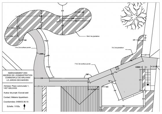 Ecowal a été contacté afin de créer un jardin des mariés au sein d'une administration communale. L'espace est régulièrement traversé par le personnel administratif mais également par les citoyens (proximité d'une école). L'espace comporte quelques zones de plantations le long du chemin pavé sans grand intérêt. Une table de pique-nique est disposée au sein de la pelouse.