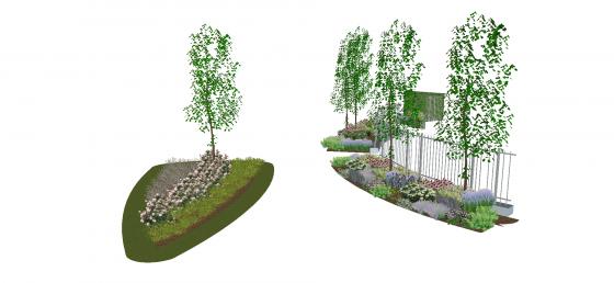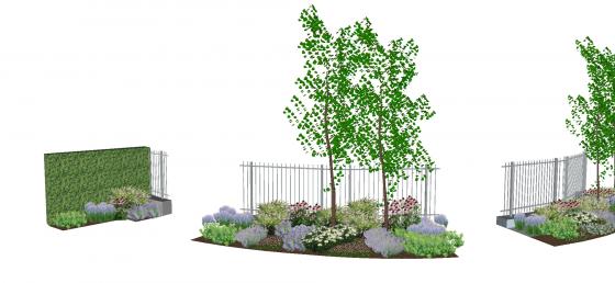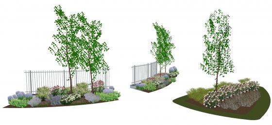 Un parterre composé d’arbustes, de graminées et de vivaces a été réalisé aux pieds des arbres. Ce parterre aux tons rose-violet, marquera l’entrée du cimetière et accompagnera les visiteurs le long du sentier.