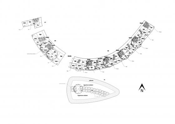 L ‘alignement d’arbres existants (Carpinus betulus‘Fastigiata’) a été conservé. Les arbres permettent en effet d’atténuer le grillage d’entrée et de marquer l’entrée du cimetière depuis la route.