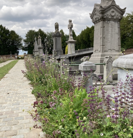 Nous défendons, chez Ecowal, l’option de la re-végétalisation des cimetières, à l’image des cimetières militaires, ou des cimetières civils anglo-saxons et germaniques. Outre la facilité d’entretien (par rapport au désherbage), cette solution crée un chaînon supplémentaire dans le maillage écologique, donne au cimetière une fonction d’espace vert et crée des conditions plus favorables au recueillement.